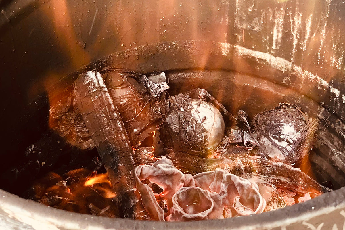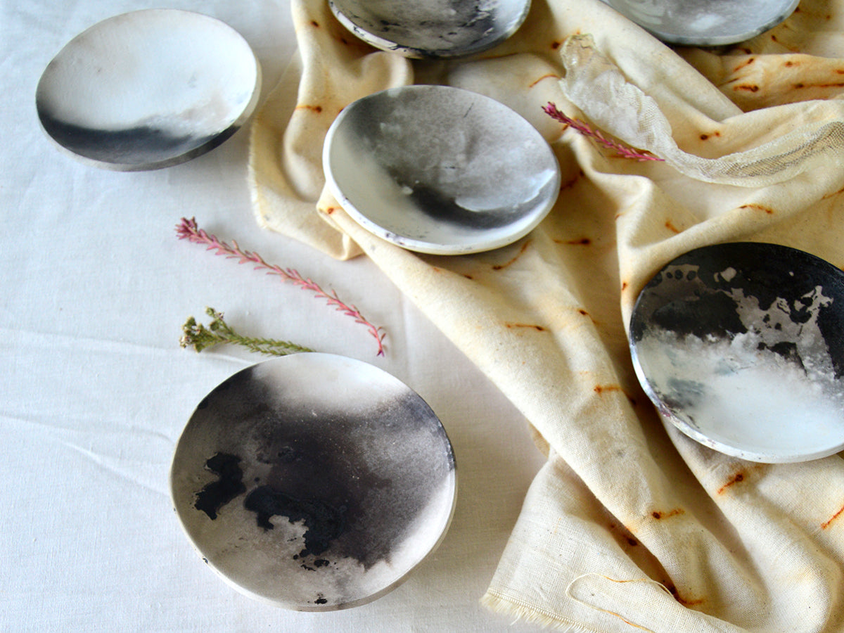 These bundles are then packed into a drum or pit and a fire is built around them. The fire reaches around 680℃, at which point the organic elements combust and release vapours that are absorbed into the porous ceramic surfaces to create dreamy markings, textures and colour.