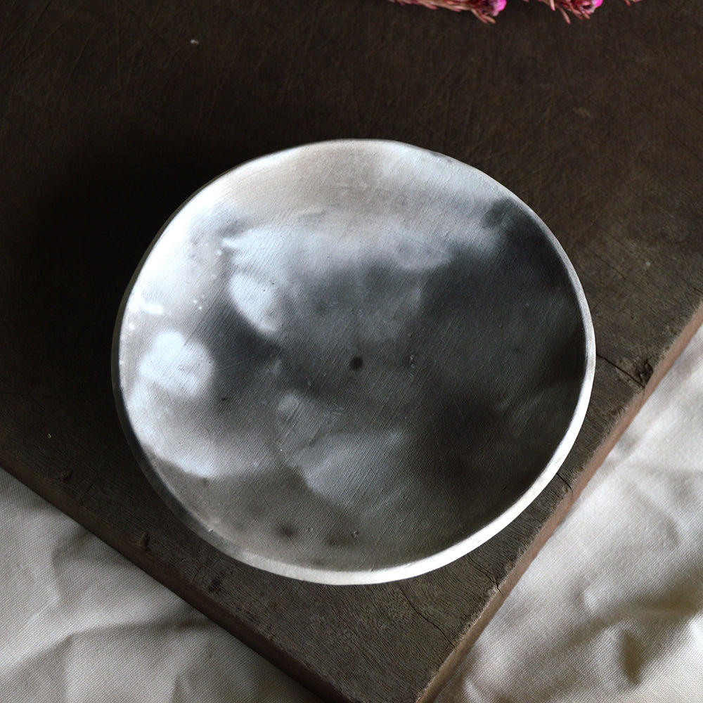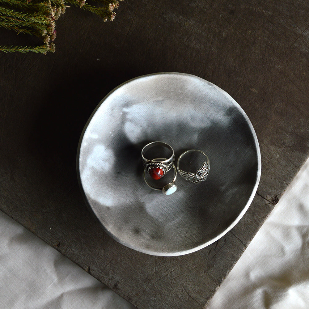 These small Callisto trinket dishes are individually wrapped up with natural elements and pit fired to leave carbon impressions in the clay.
